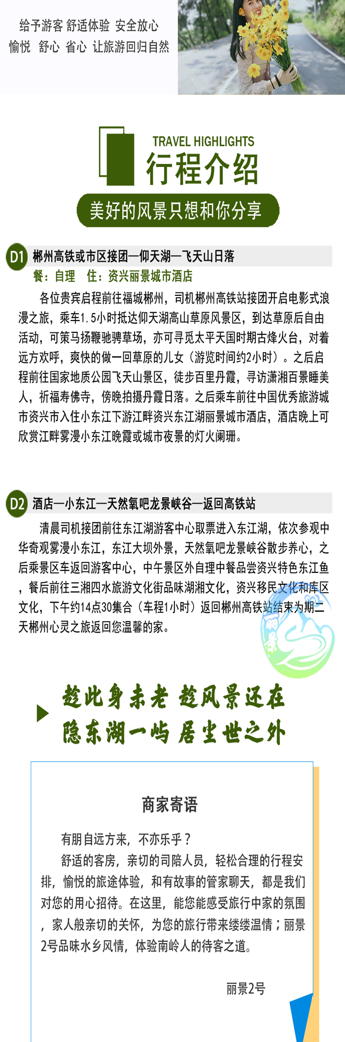 門(mén)票:仰天湖大草原門(mén)票+東江湖線(xiàn)路一門(mén)票+車(chē)費+飛天山景區大門(mén)票