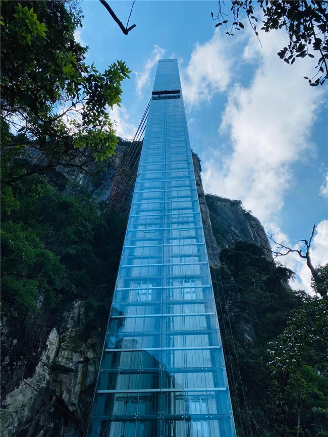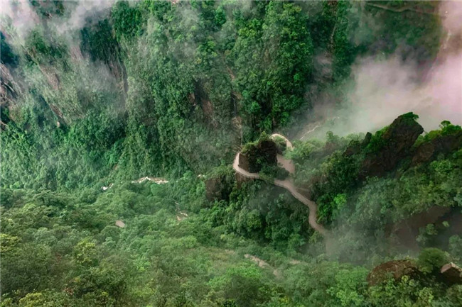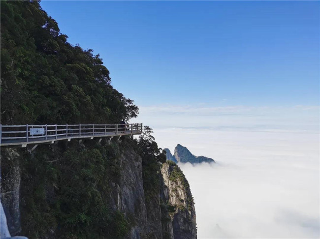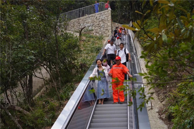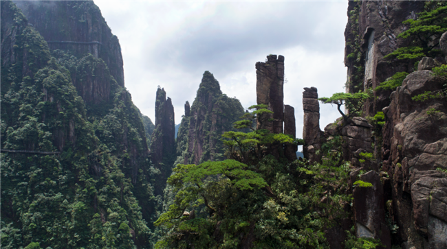 東進(jìn)東出:索道五指峰站→乘坐索道→索道天臺寺站→棧道中線(xiàn)→峽谷餐廳→摩天嶺電梯→棧道上線(xiàn)→小天臺→天臺寺→天臺小徑→棧道中線(xiàn)→索道天臺寺站→乘坐索道→索道五指峰站